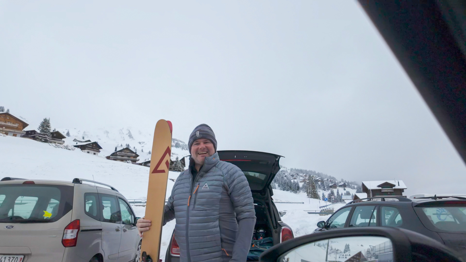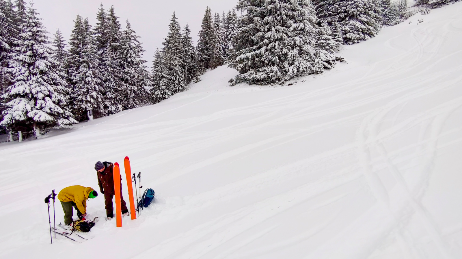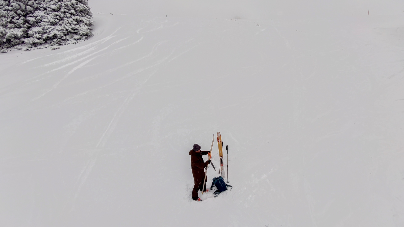 Après avoir préparé notre équipement, nous entamons une petite montée en peaux de phoque. L’occasion idéale pour tester le dernier jouet d’Alban : un HoverAir. Ce petit drone autonome, minuscule et ultraléger, décolle directement depuis la main et filme en toute autonomie. Les plans qu’il produit sont hallucinants de qualité et ajoutent une belle touche à notre sortie.