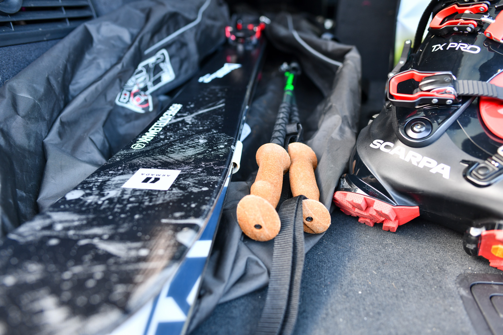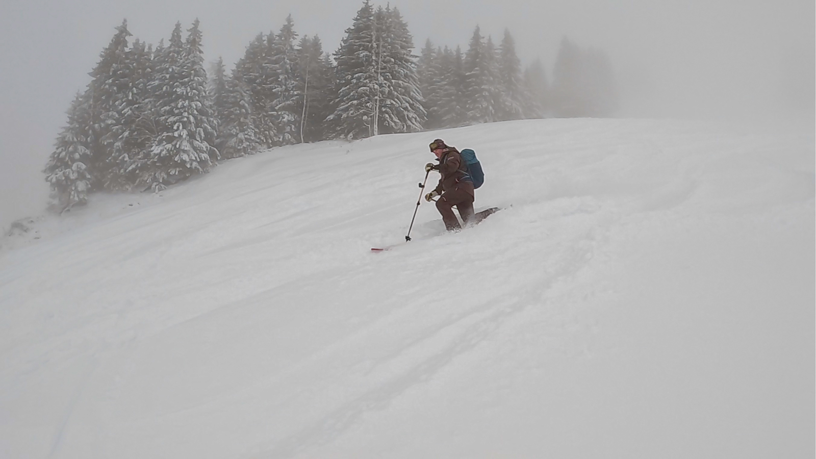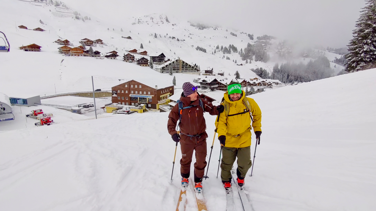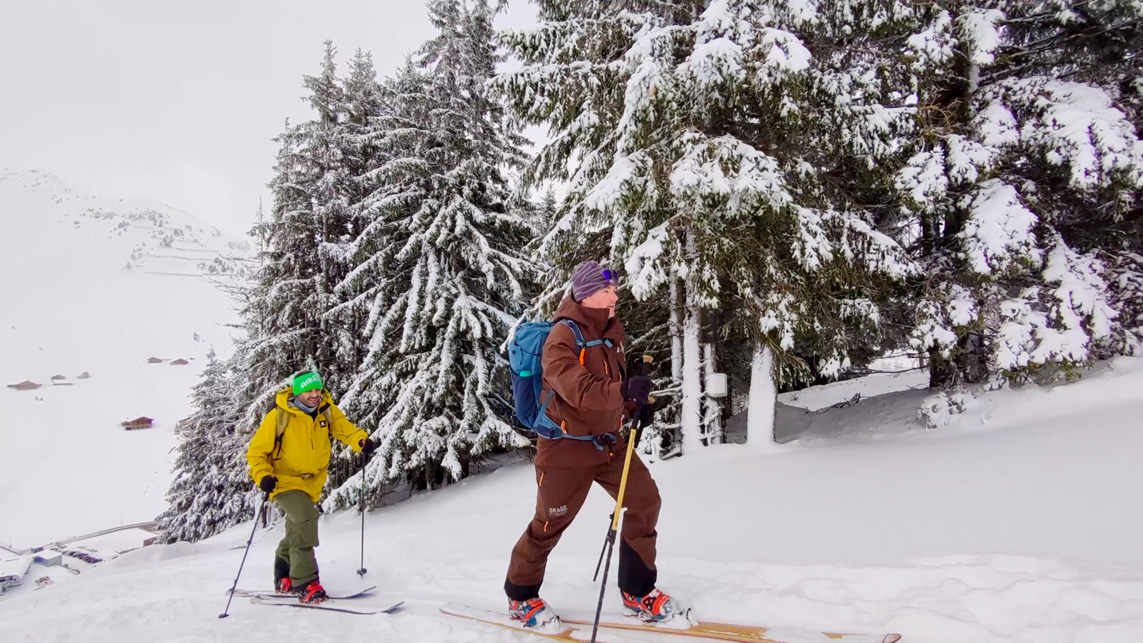 Après avoir préparé notre équipement, nous entamons une petite montée en peaux de phoque. L’occasion idéale pour tester le dernier jouet d’Alban : un HoverAir. Ce petit drone autonome, minuscule et ultraléger, décolle directement depuis la main et filme en toute autonomie. Les plans qu’il produit sont hallucinants de qualité et ajoutent une belle touche à notre sortie.