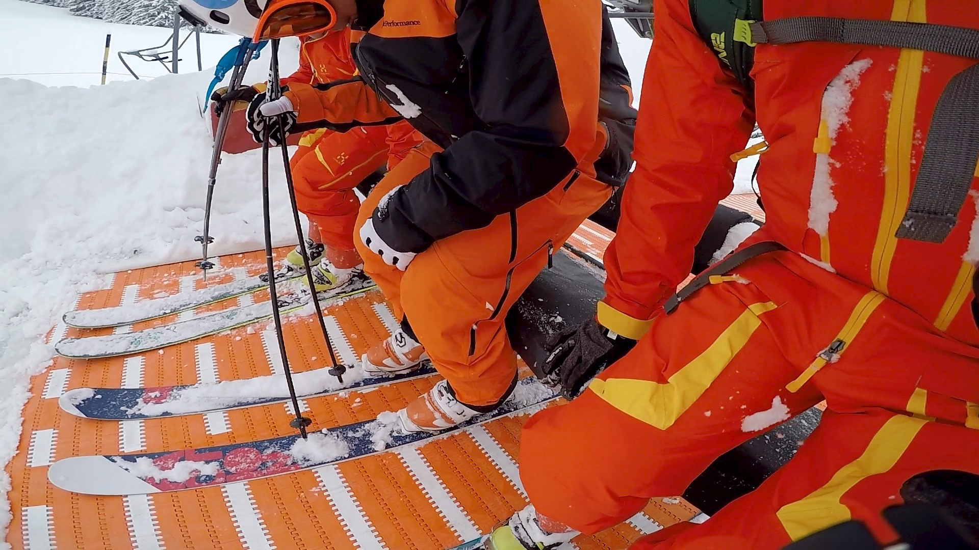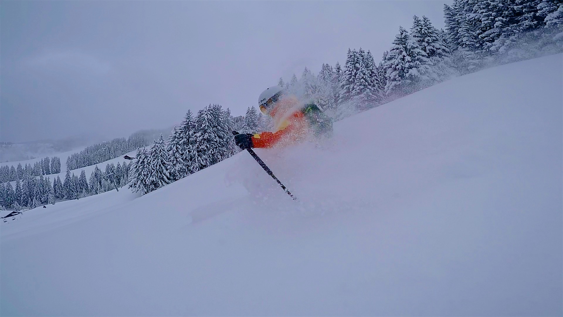 Il a neigé toute la nuit, plus de 50cm de neige fraîche dans la station, le rêve… Une seule installation tourne pour le moment à cause du minage pour sécuriser les liaisons. Cela nous permet de nous chauffer sur cette unique piste, entre quelques sapins…